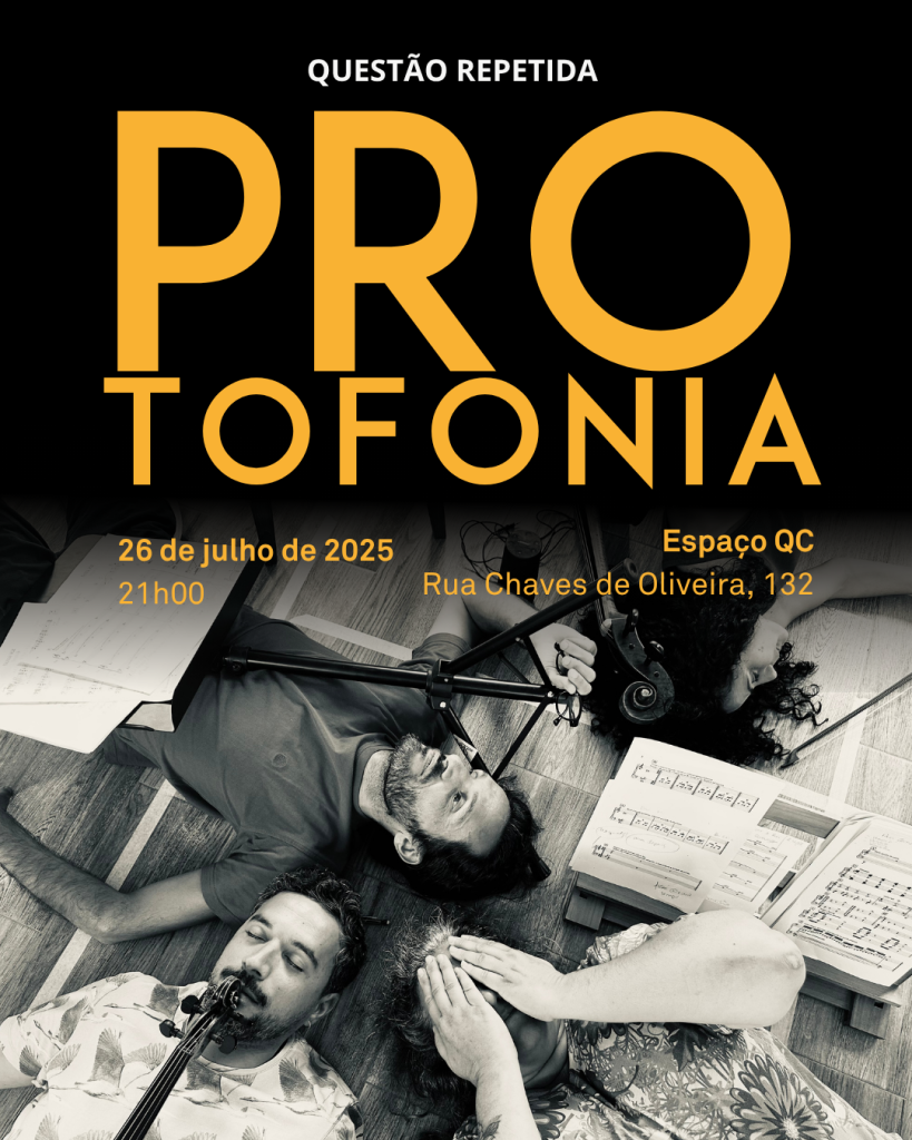 Protofonia é um momento de pesquisa prático-teórico dirigido a compositores, instrumentistas e um cantor sobre de que forma se relacionam corpos entre si, com o espaço, e com os seus meios de trabalho diários (neste caso os instrumentos musicais e a voz). A pesquisa é realizada num ambiente de imersão e desenvolve-se transversalmente, e em partes iguais, a partir de experiências que a dança e a música, em cruzamento, podem proporcionar. O projeto pretende não só estimular a compreensão e assimilação do que é revelado – tirar maior partido da relação do corpo com o instrumento, com o espaço, e com a própria composição musical – mas também gerar uma história daquele coletivo. Os aspetos referidos que a pesquisa pretende atingir, são hoje inerentes às artes performativas em geral, mas são muitas vezes postos de lado pelos músicos, devido à natureza e exigência do seu trabalho, que os obriga, para obter resultados mais rápidos, a estudar o seu instrumento isolados, recorrendo à posição tradicional para tocar o instrumento, e à partitura. As soluções que se apresentam como muito efetivas, acabam também por asfixiar a potencialidade da relação músico-instrumento. Neste sentido, será lançado um desafio a uma coreógrafa que cruze as duas linguagens e aos compositores João Pacheco e João Segura, para guiarem a pesquisa, criando em conjunto exercícios exploratórios que integram a música, a utilização do corpo e do instrumento, a provocação de ideias, e a desconstrução de rotinas, forjando um caminho que é realizado durante os diversos encontros intensivos, onde se irão fundir também 3 músicos-instrumentistas e 1 cantor, que acompanha todo o processo. Uma partilha de outras formas de ver e fazer, outro momento de desafios e trocas de saberes e metodologias.
